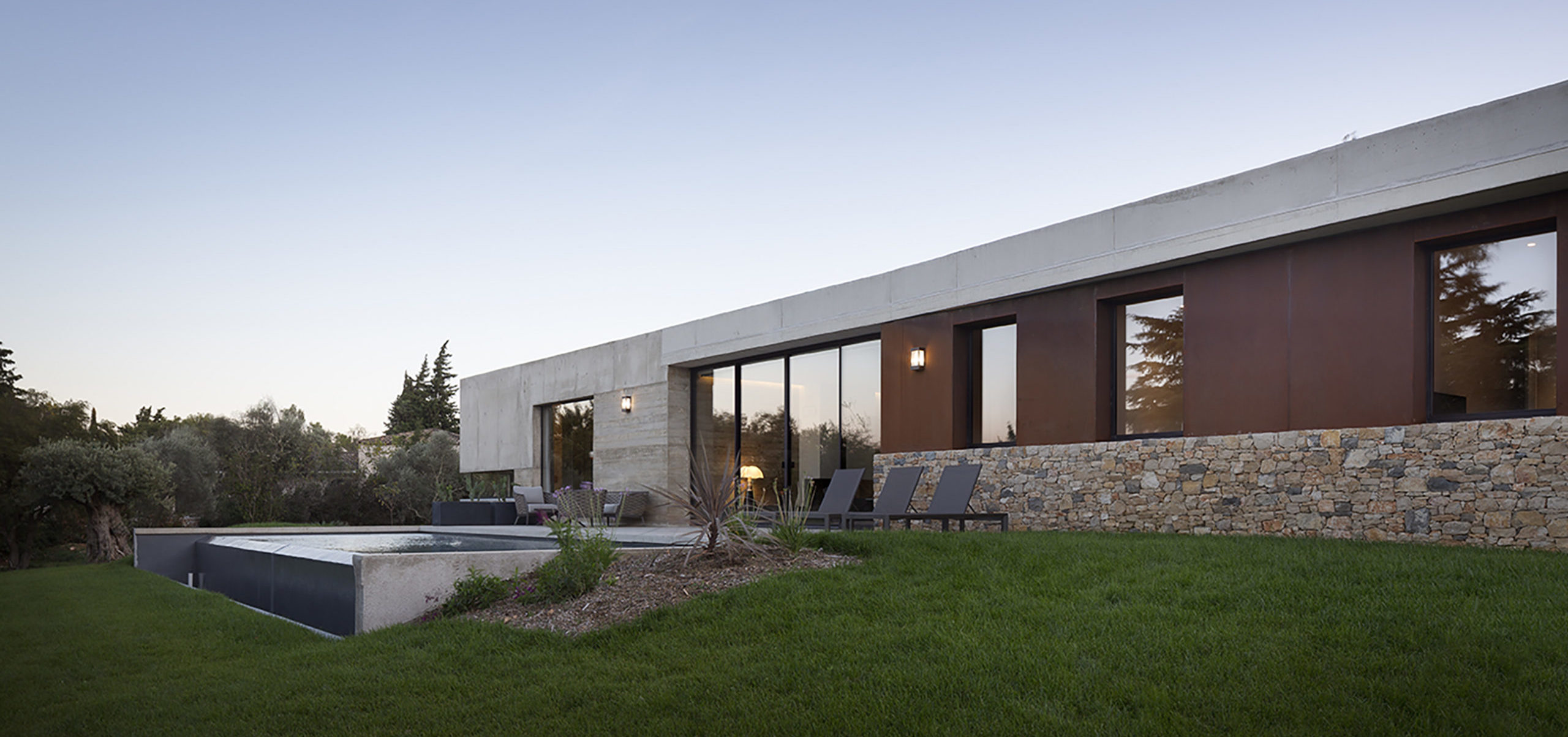 Cette maison individuelle de 250 m2 se situe sur la commune de Nîmes (Gard). Livrée en 2020, la maison est conçue sur la base de quatre volumes décalés les uns par rapport aux autres et implantée en longueur avec un jeu de paliers intérieurs pour respecter la configuration du terrain. Un mur de parement pierre se prolonge à l’intérieur du bâtiment et se mélange avec le béton brut et l’acier Corten. La maison a fait l’objet d’un reportage et vidéo par le journal Midi Libre le 17 octobre 2020.