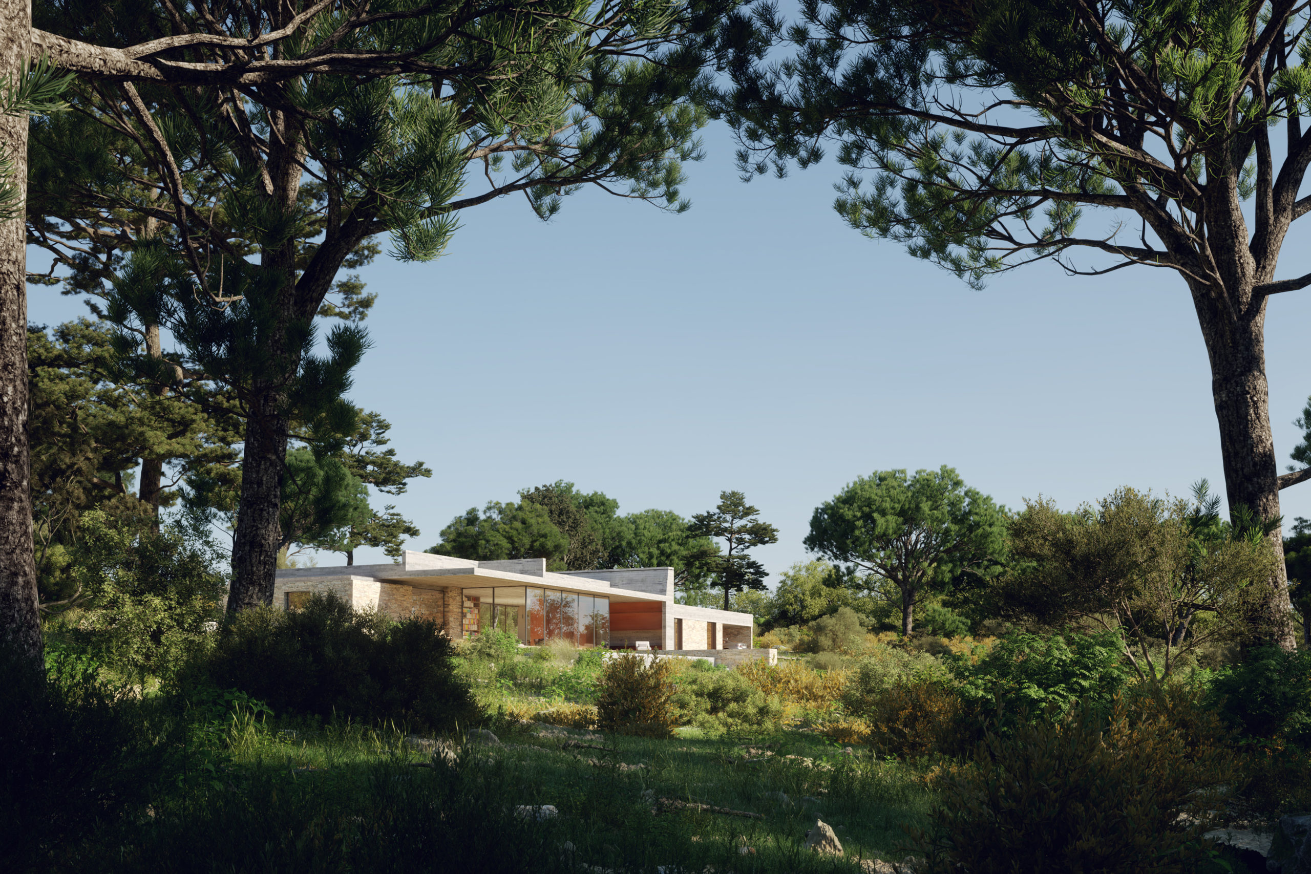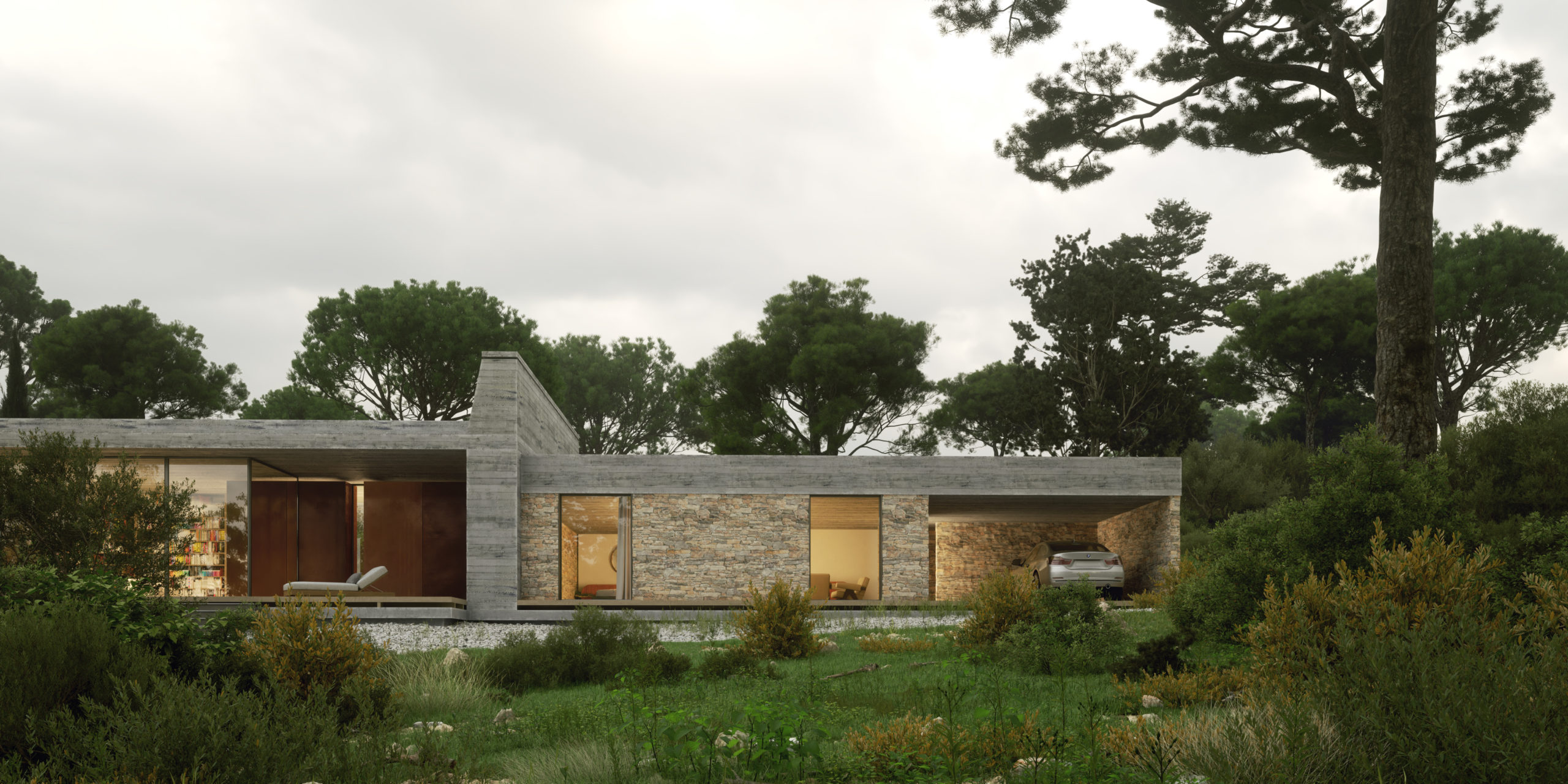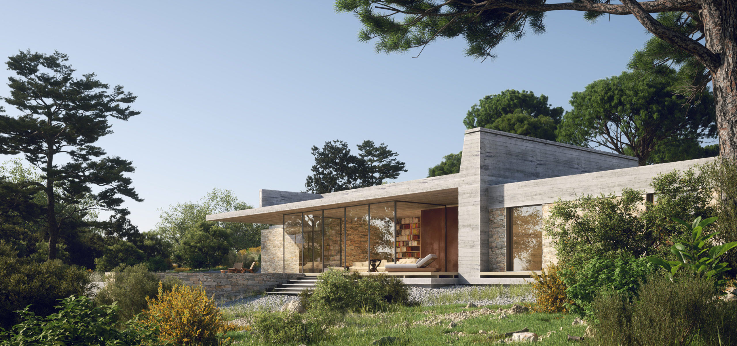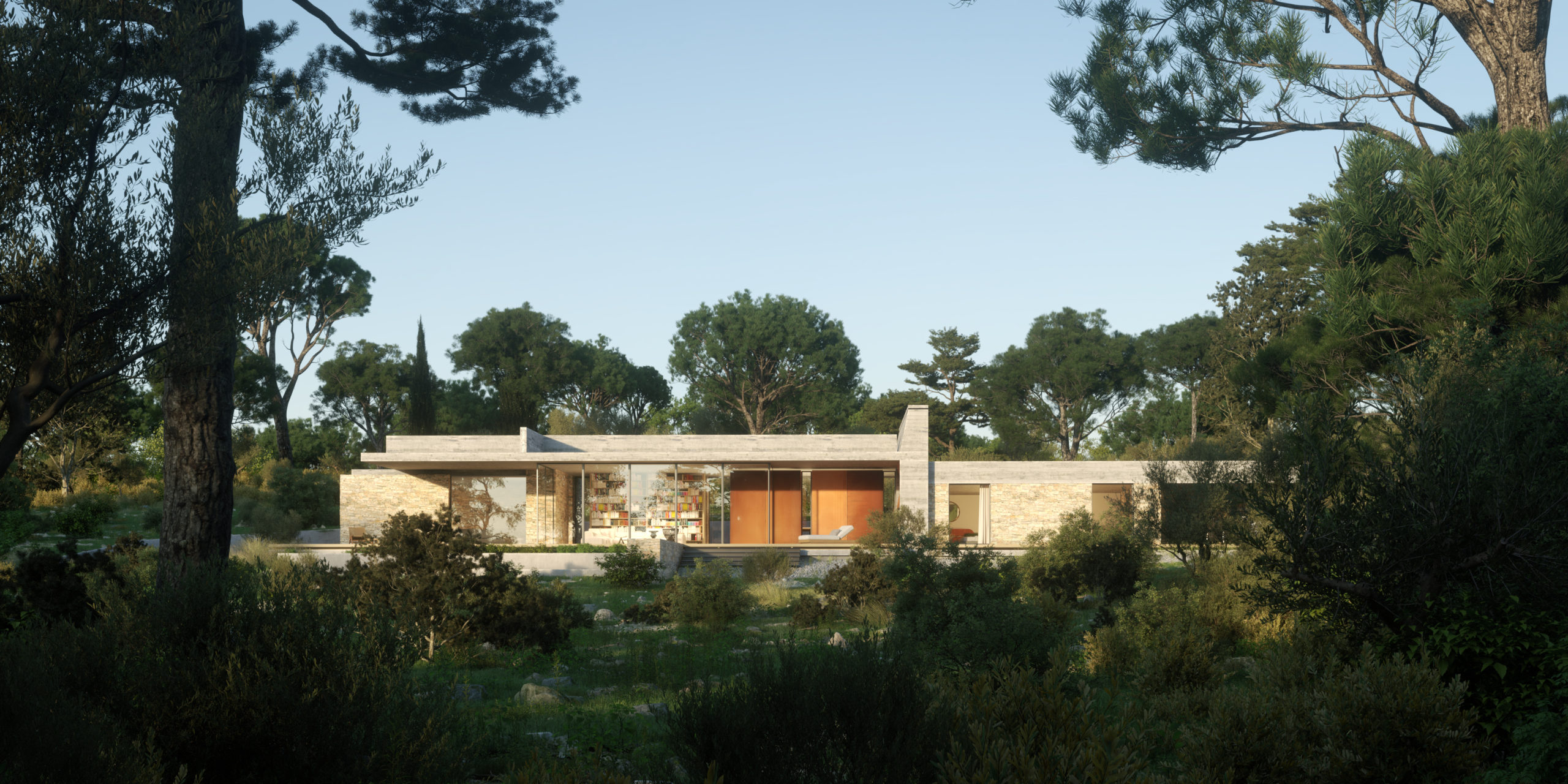 Cette maison est en cours d'étude sur la commune de Nîmes (Gard) . La maison est constituée de deux volumes en pierres sèches de garrigue reliés par de larges baies vitrées. Elle se caractérise par ailleurs par d'imposantes lignes verticales en toiture qui traduisent la trame intérieure et donnent son caractère au projet. L'acier Corten et le béton brut banché mettent également en valeur les façades.